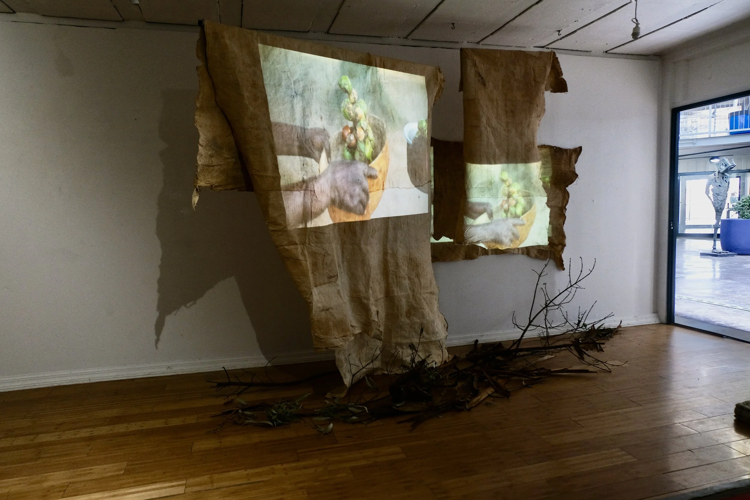 Projected onto bark cloth, a traditional Ugandan textile made from the bark of the Mutuba tree, the work MATERIALIZES the link between land, body, and memory.
